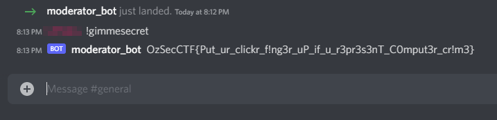 Visit the linked Discord server and see that an admin of the server added a bot. This bot has a secret, but will only give it to you if you are a member of an ‘ADMIN’ role.