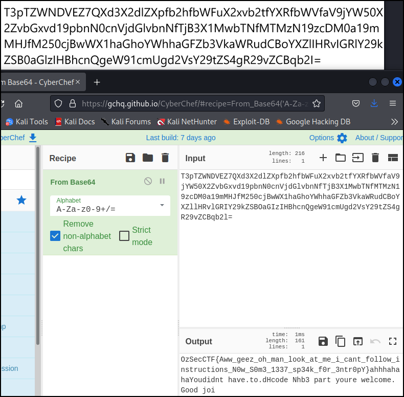 OzSecCTF{Aww_geez_oh_man_look_at_me_i_cant_follow_instructions_N0w_S0m3_1337_sp34k_f0r_3ntr0pY}