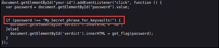 Checking source there is a script.js that is loaded. Checking this file we see a password check. The password it’s checking against is right here in cleartext.